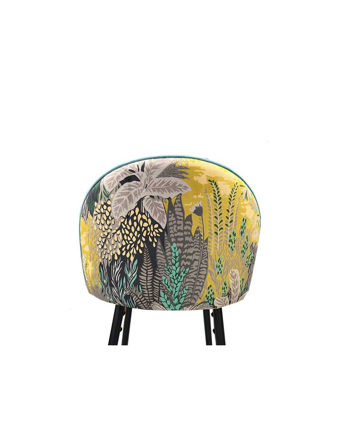 Taburete de diseño, armazón metálico con acabado epoxi negro, asiento y respaldo tapizados en terciopelo azul, trasera en tejido decorado palm. Otros colores disponibles. Silla a juego