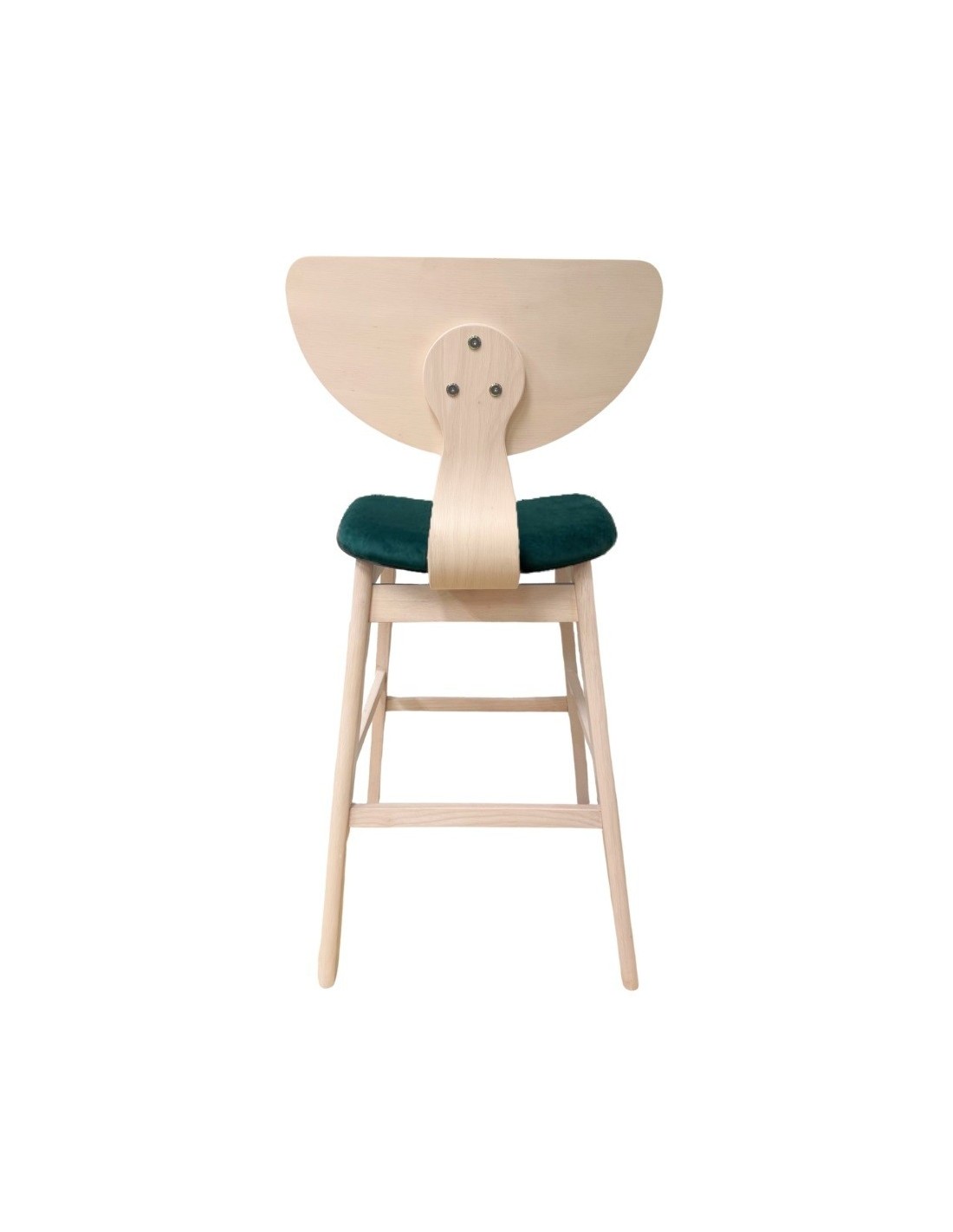 Taburete de diseño, multiusos, armazón de madera maciza de hevea, asiento y respaldo de contrachapado de madera de hevea, barnizado natural, tapizado velvet verde oscuro. Sillón a juego