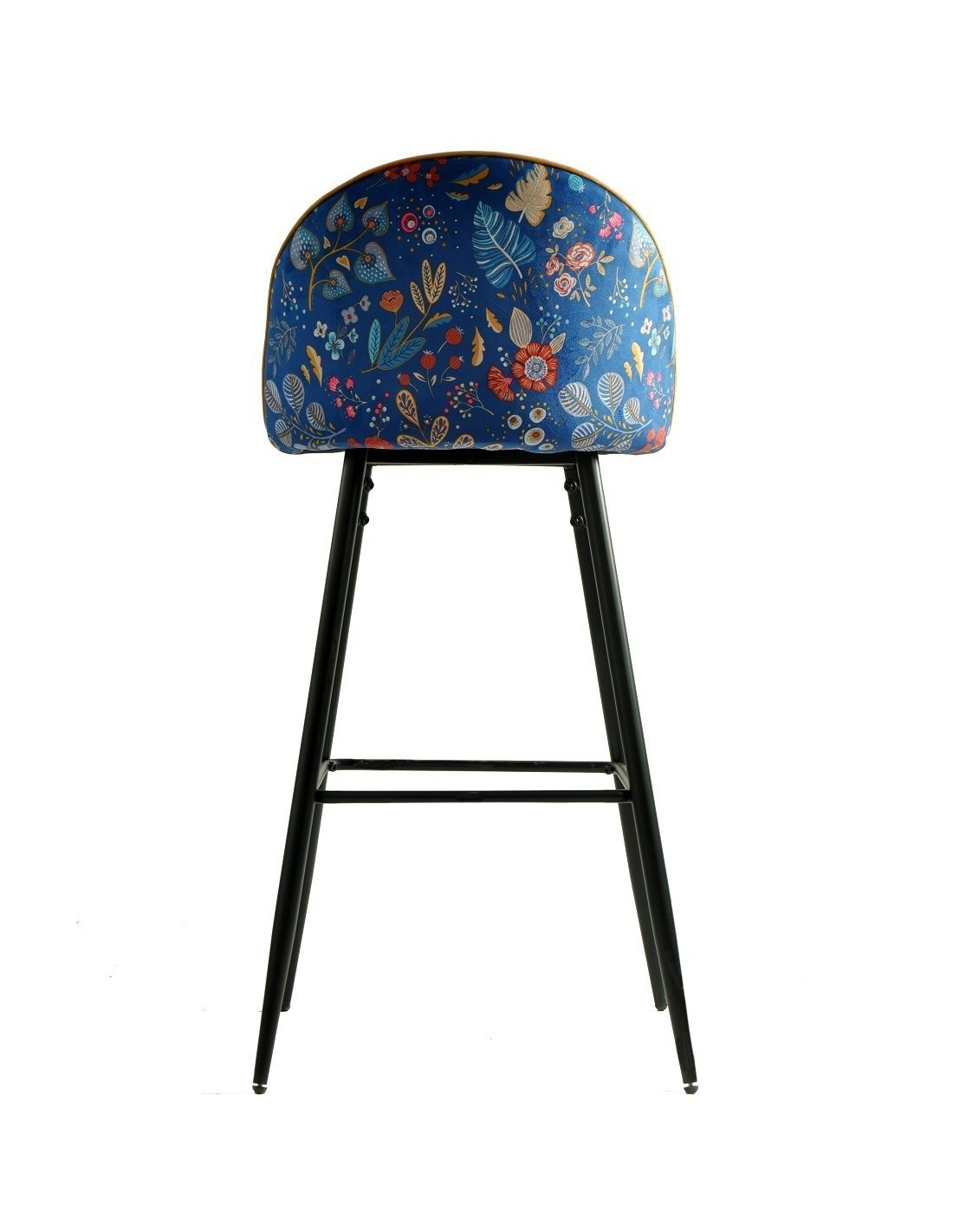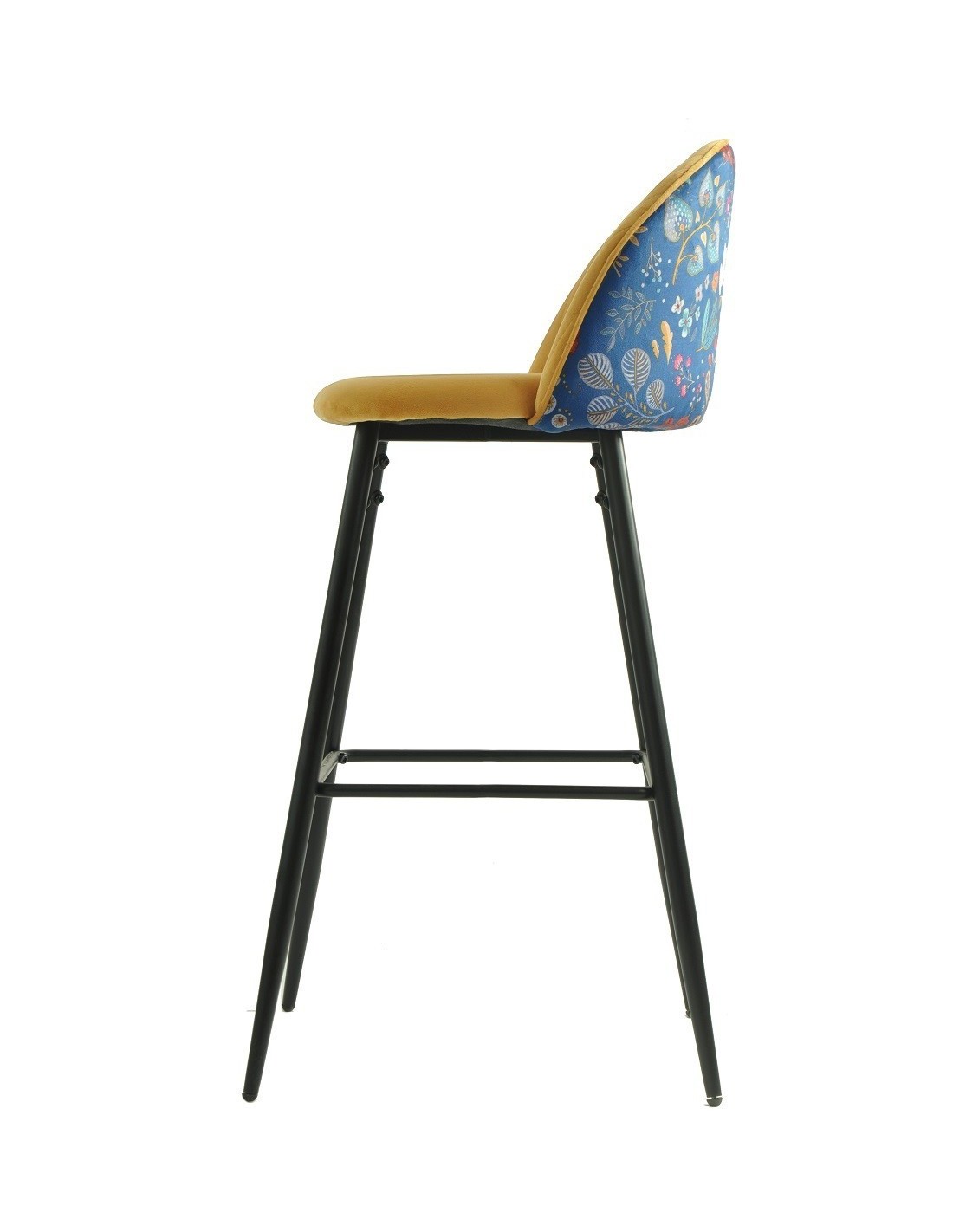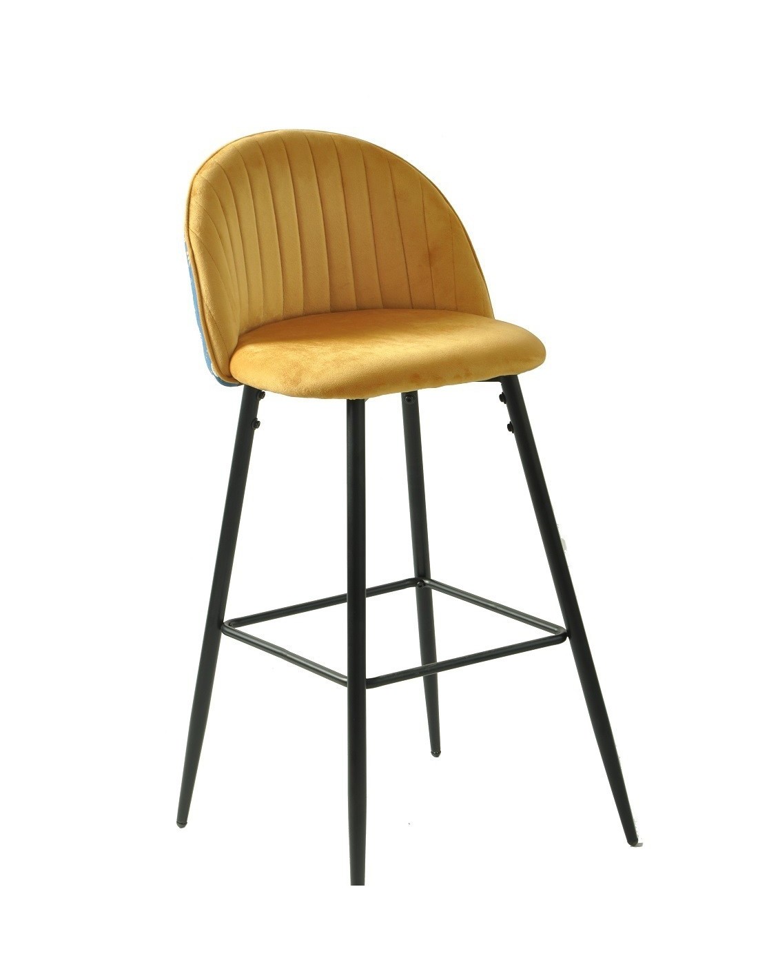 Taburete de diseño, armazón metálico con acabado epoxi negro, asiento y respaldo tapizados en terciopelo amarillo, trasera en tejido decorado carnaval. Otros colores disponibles. Silla a juego